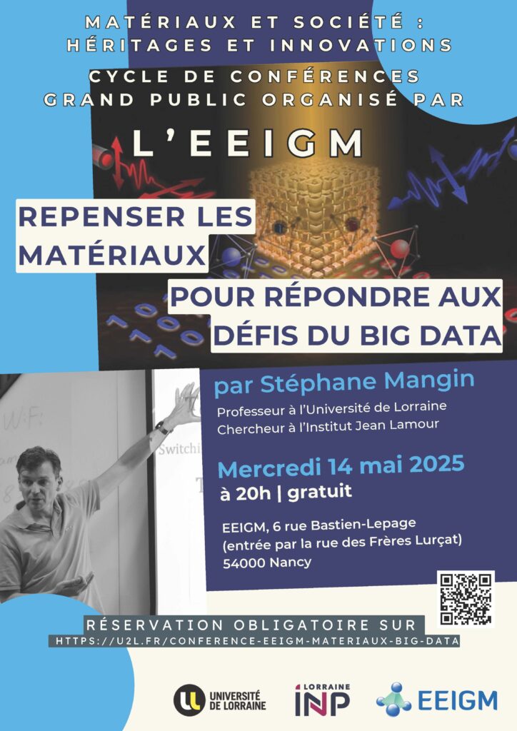 Dans le cadre de son cycle de conférences grand public “Matériaux et société : héritages et innovations”, l’EEIGM a le plaisir de recevoir Stéphane Mangin, professeur à l’Université de Lorraine et chercheur à l’Institut Jean Lamour autour de sa présentation “Repenser les matériaux matériaux pour répondre aux défis du big data”, le mercredi 14 mai 2025 à 20h00 (durée : 1h00).