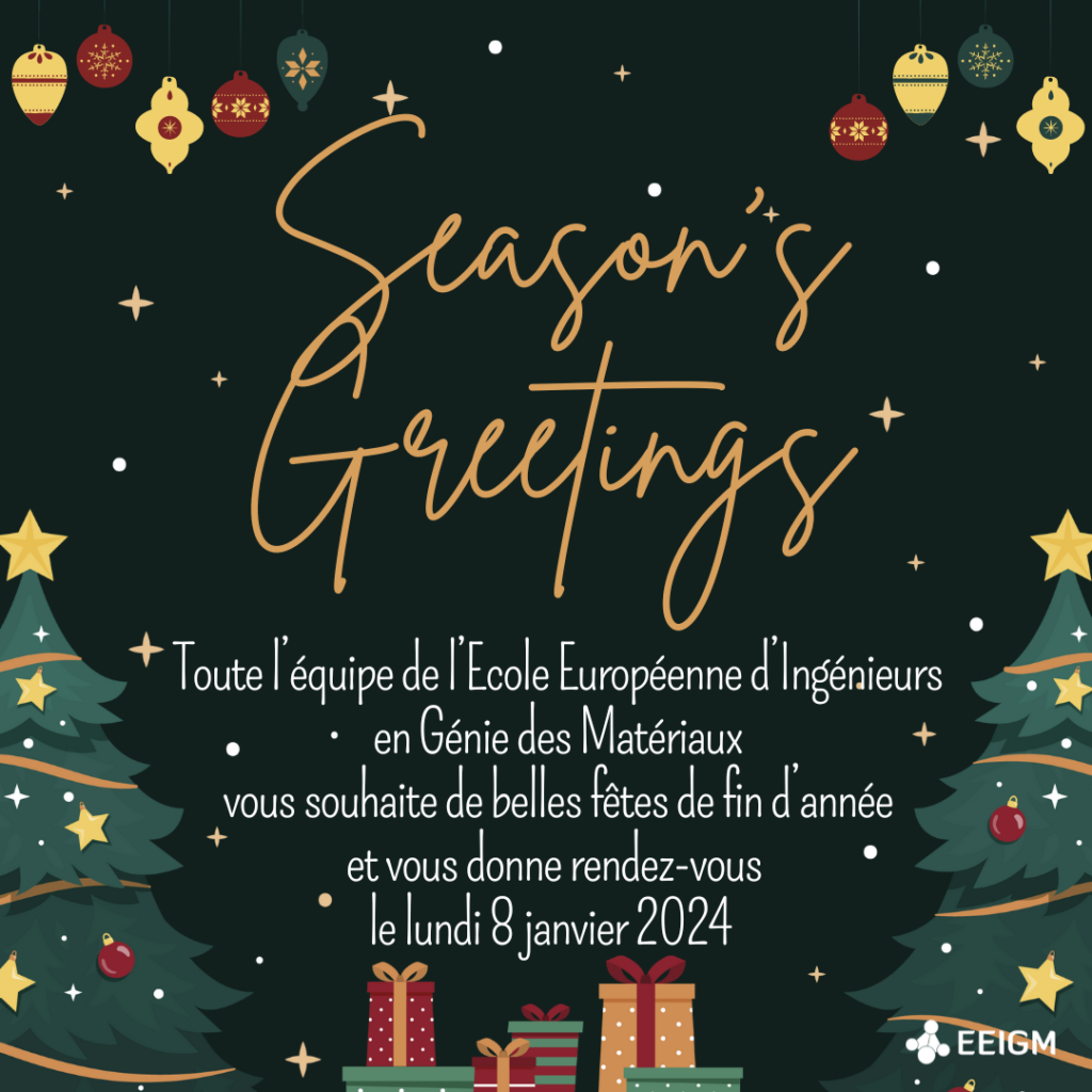 L’EEIGM sera fermée du vendredi 22 décembre 2023 soir et rouvrira le lundi 8 janvier 2024, matin. Toute l’équipe de l’EEIGM vous souhaite de belles fêtes de fin d’année !